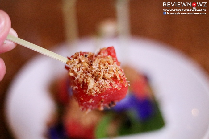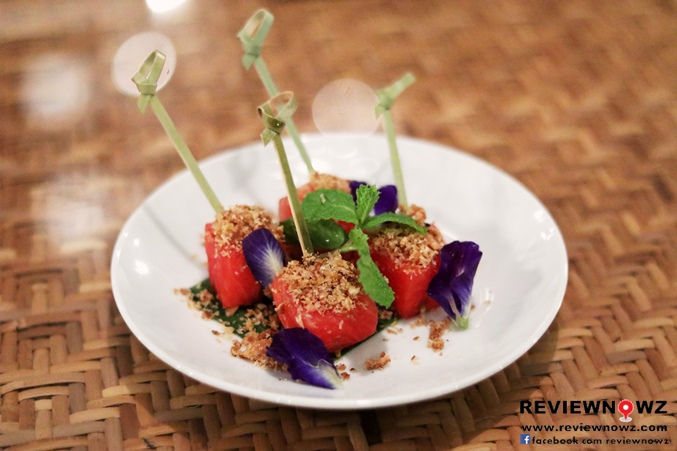 ฟรีจากทางห้องอาหารกับแตงโมเนื้อฉ่ำหั่นเต๋าขนาดพอดีคำโรยด้วยเนื้อปลาแห้งและน้ำตาล