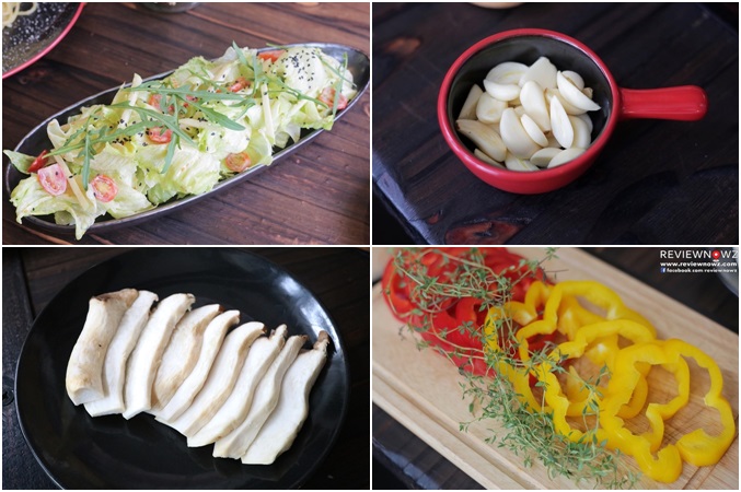 มีสลัด, เห็ด, ผักสดตามฤดูกาล, และกระเทียมให้ทานแกล้ม