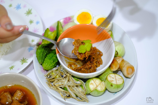 ว่าแล้วก็เปิดครัว หาของเท่าที่มี จะผักสด ไข่ต้ม ปลาแห้งใช้ได้หมดเลย เพราะของเหล่านี้เมื่อทานคู่กับน้ำพริกมะขามอ่อนที่รสชาติกลางๆ ไม่เผ็ดมากจนเกินไป มีส่วนผสมของเนื้อไก่บด รสชาติถูกปากทานได้ทุกคน เป็นน้ำพริกที่ทานคู่กับอะไรก็เข้ากันดีมาก