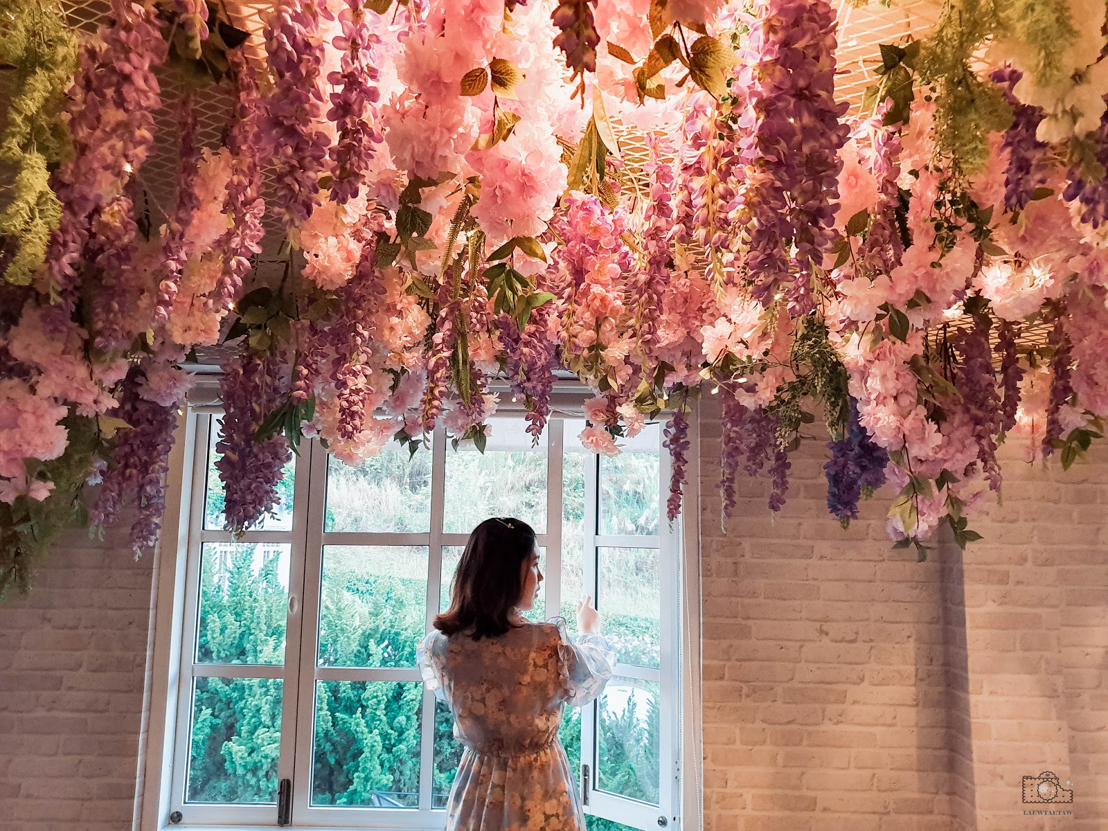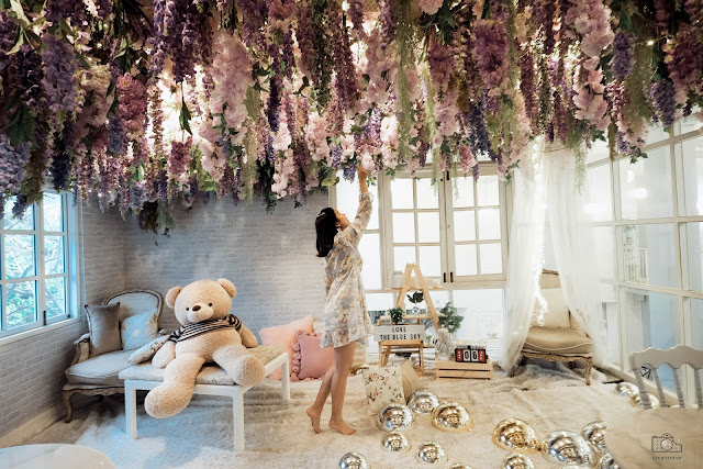 แถมชั้นสองของคาเฟ่เป็น indoor มีมุมตุ๊กตา หนังสือ ไฟ ให้เป็นพรอพได้เล่นถ่ายรูปอีกด้วย ด้านบนเพดานก็ตกแต่งเป็นดอกไม้สีชมพูระย้าลงมา อลังและสวยจริงๆๆ