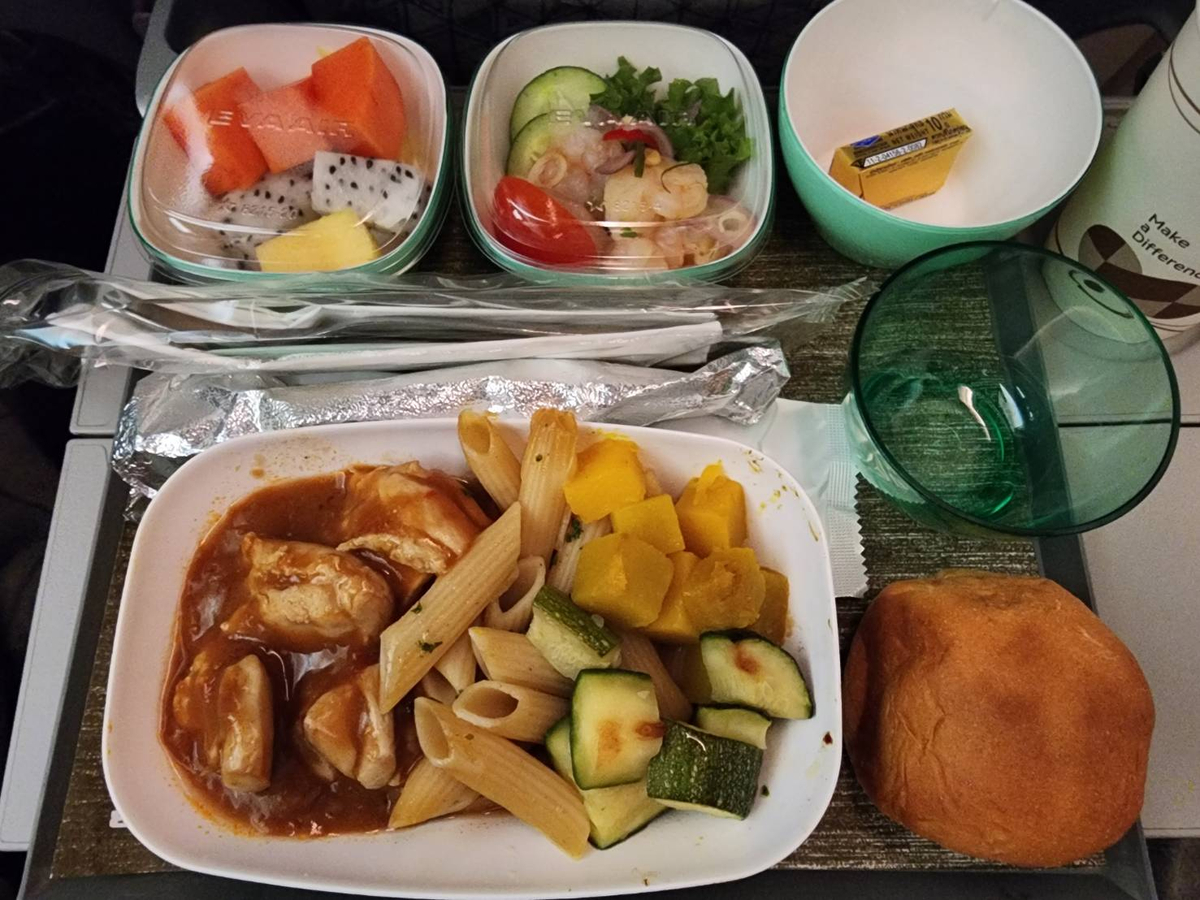อาหารบนเครื่องเริ่มเสิร์ฟประมาณตี 3 ครับ เมนูคือเพนเน่ไก่ผัดซอสออกแนวจีนๆครับ