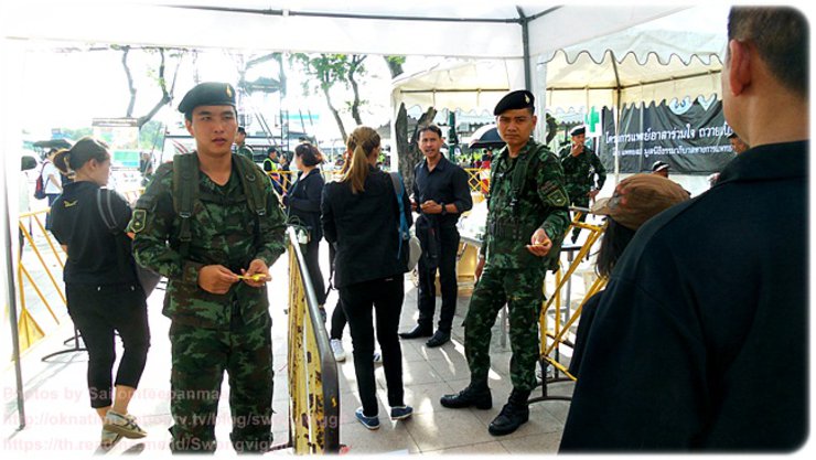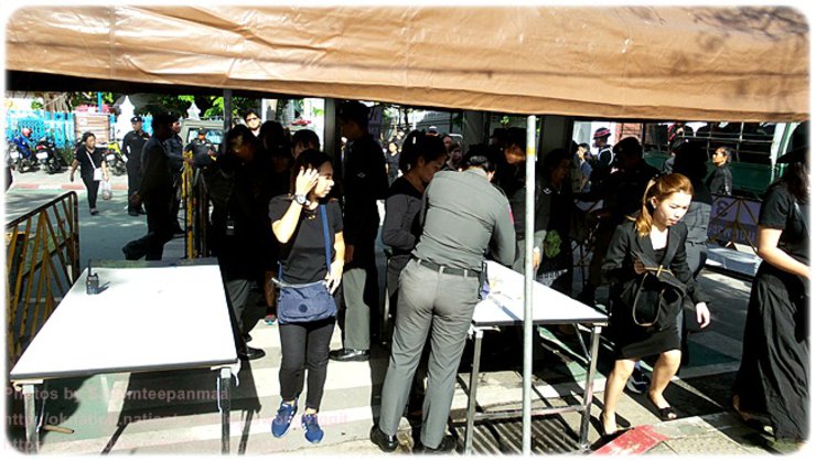 ฉันเดินตัดหน้าพิพิธภัณฑ์สถานแห่งชาติ มหาวิทยาลัยธรรมศาสตร์ ไปยังบริเวณหน้าวัดมหาธาตุยุวราชรังสฤติ์ด้านซ้ายมือ ซึ่งเป็นทางเข้าสนามหลวงจะมีจุดคัดกรอง และตรวจค้นอาวุธ ซึ่งจัดเป็นสองแถว จะมีการตรวจกระเป๋า และอาวุธต่าง ๆ ที่อาจจะติดกระเป๋ามากับผู้มาร่วมลงนามถวายความไว้อาลัย