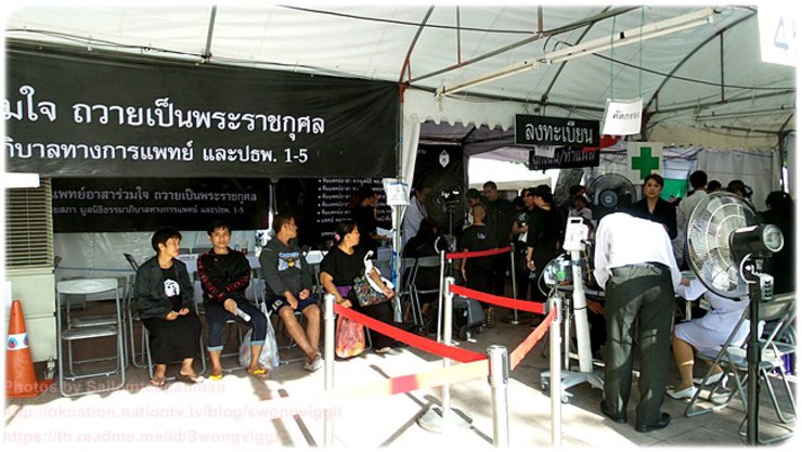 แค่เห็นพระพักตร์ในพระบรมฉายาลักษณ์ของพระองค์ก็ใจหาย หลาย ๆ คนร้องไห้ออกมา หลาย ๆ คนหัวตารื้นด้วยสำนึกในพระมหากรุณาธิคุณอย่างหาที่สุดมิได้ของพระองค์ เมื่อเรากราบพระบรมฉายาลักษณ์ที่ถูกจัดไว้อย่างสวยงาม เหมาะสม เรียบร้อยแล้ว เจ้าหน้าที่ก็จะสั่งให้เราทุกคนยืนขึ้น สำหรับใครที่ต้องการจะร่วมทำบุญก็จะมีพานสำหรับรองรับเงินทำบุญ รวมถึงตู้สำหรับใส่เงินที่พสกนิกรต้องการร่วมทำบุญถวายไว้อย่างเป็นระเบียบ