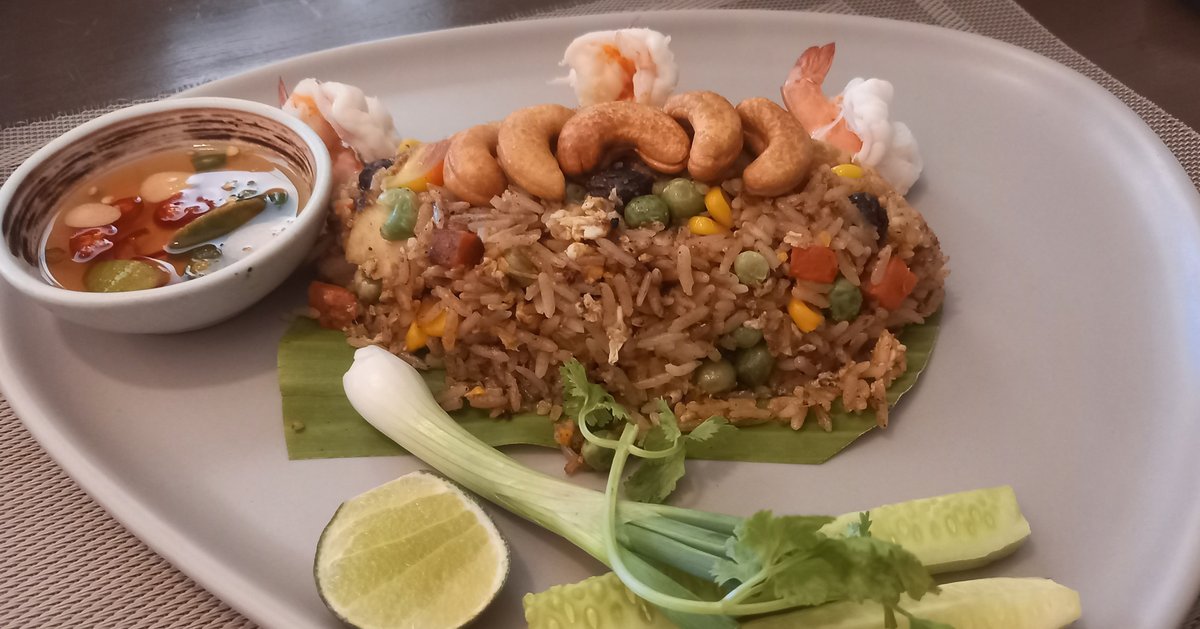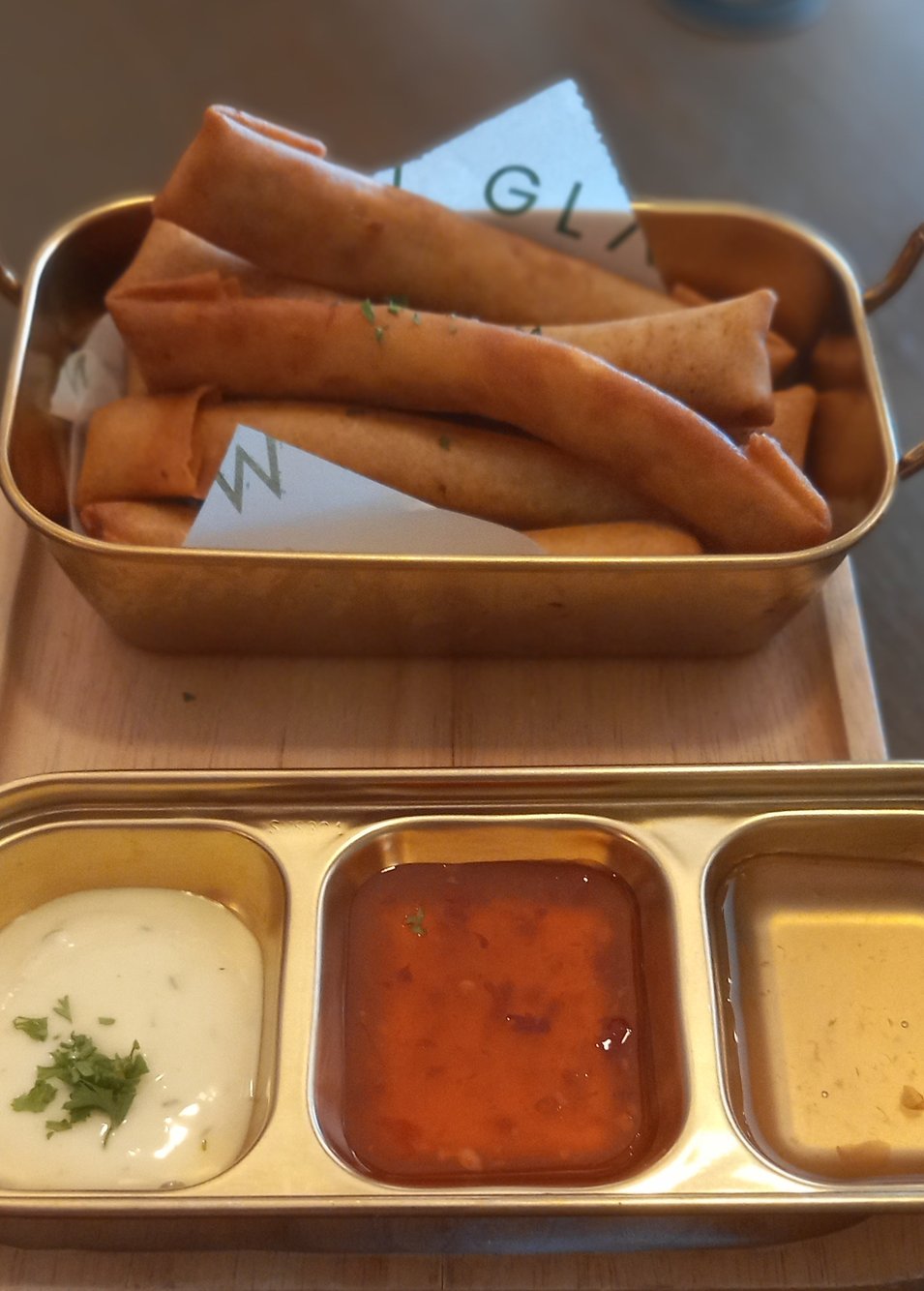 สุดท้ายเลยได้หยุดรถที่ร้าน GLAM & GOMME (อ่านว่า แกรม & กอม) เมนูที่ร้านนี้ มีมากจนอยากที่สั่งมากินทุกอย่าง แต่ด้วยไปกันแค่ 2 คน เลยเอาเท่าที่ไหว เลยตัดสินใจเลือก ราดหน้าหมู (จานอย่างใหญ่) กิน 2 คน ยังได้ ตามด้วยแกรมโรล (เป๊าะเปียะทอด ไส้หมูผสมกุ้ง) มาพร้อมน้ำจิ้ม 3 รส ให้ลิ้มลอง ซอสครีม น้ำจิ้มไก่ และน้ำจิ้มบ๊วย อีกหนึ่งเมนูที่เพื่อนร่วมทางสั่งก็คือ ข้าวผัดสับปะรด มีกุ้ง โรยด้วยถั่วลันเตา เม็ดหัวครก (เม็ดมะม่วงหิมพานต์)