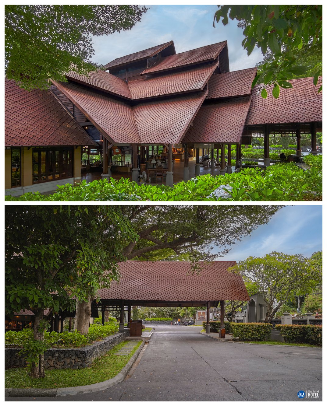 อาคาร Lobby สไตล์ไทยประยุกต์ สร้างจากไม้จริงทั้งหลัง ดีไซน์ให้ลดหลั่นลงไปตามสภาพพื้นที่ที่เป็นไหล่เขา