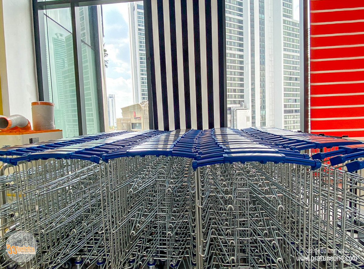 อย่างแรกก็เดินไปเอารถเข็นกันก่อน และ หยิบถาดวางบนรถเข็น แล้วไปต่อคิวสั่งอาหารกัน