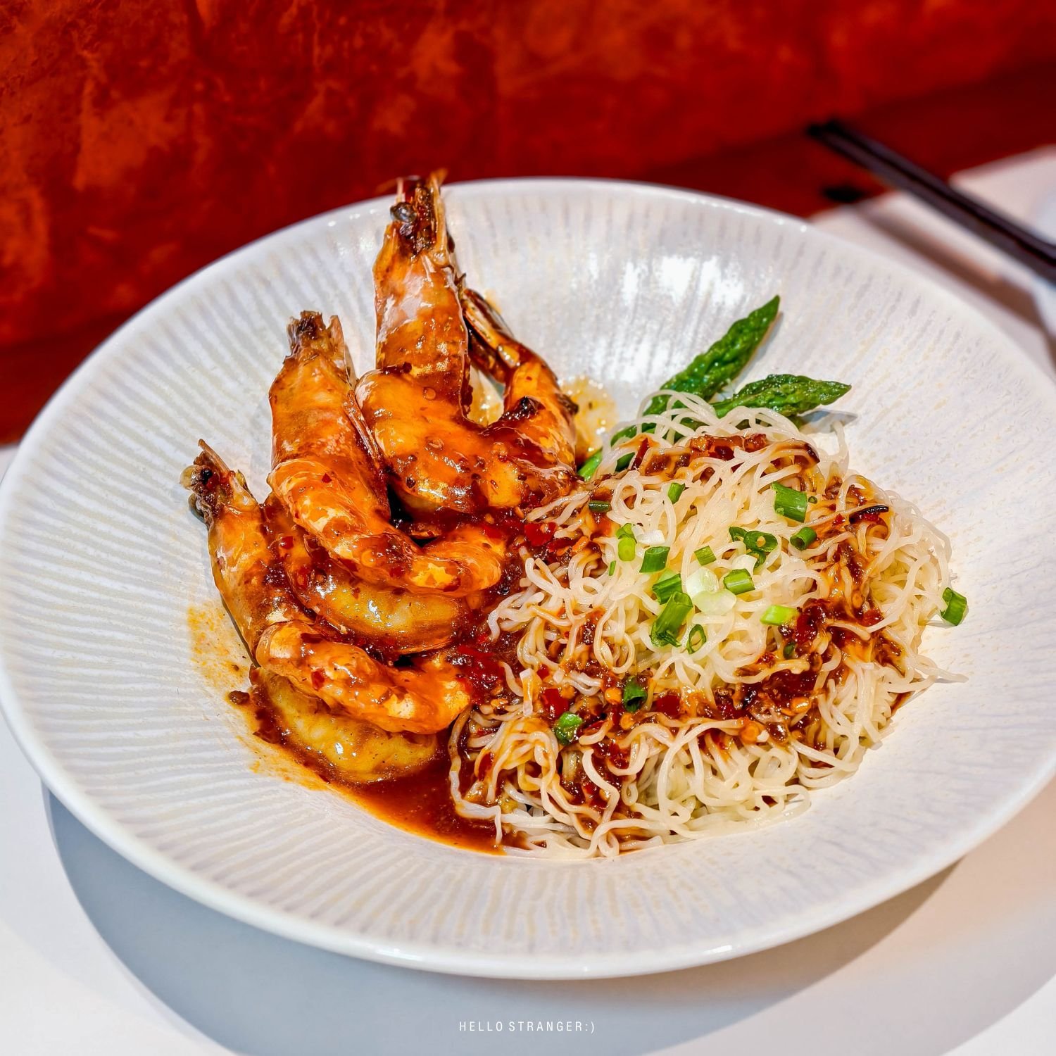 •บะหมี่กุ้งราดซอสพริกเผา เมนูใหม่ที่มีเฉพาะสาขานี้ บะหมี่เส้นเล็กนุ่มหนึบ หอมซอสพริกเผา ทานคู่กับกุ้งเนื้อเด้ง อร่อยลงตัว