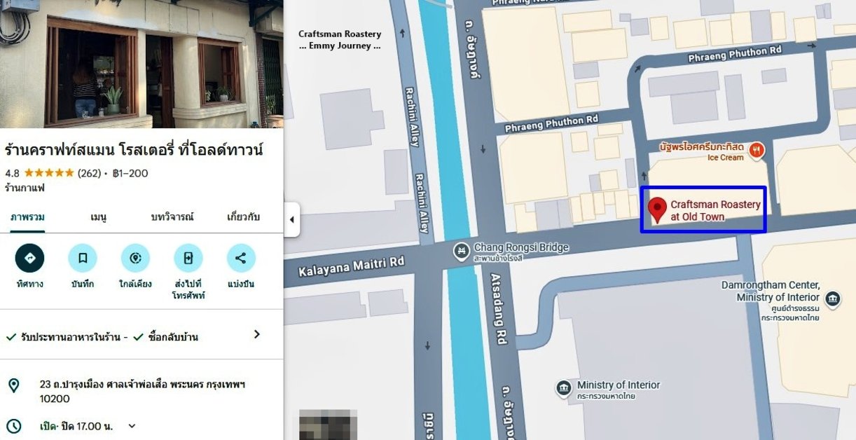 ร้านคราฟท์สแมน โรสเตอรี่ ที่โอลด์ทาวน์ (Craftsman Roastery at old town) ร้านกาแฟสุดคราฟต์ แถวย่านแพร่งภูธร อยู่ไม่ไกลจากศาลเจ้าพ่อเสือ ร้านตั้งอยู่ตรงข้ามกระทรวงมหาดไทย ที่ถนนบำรุงเมือง เขตพระนคร กรุงเทพมหานคร เปิดทุกวันตั้งแต่เวลา 07.30 - 17.00 น. มีห้องแอร์ให้บริการ จอดรถได้ริมถนนแถวร้าน (ที่จอดรถค่อนข้างน้อย)